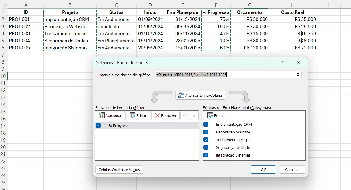 - Quando abrir a caixa de diálogo, vá para a sua planilha e selecione as colunas com os cabeçalhos: Projeto e % Progresso.